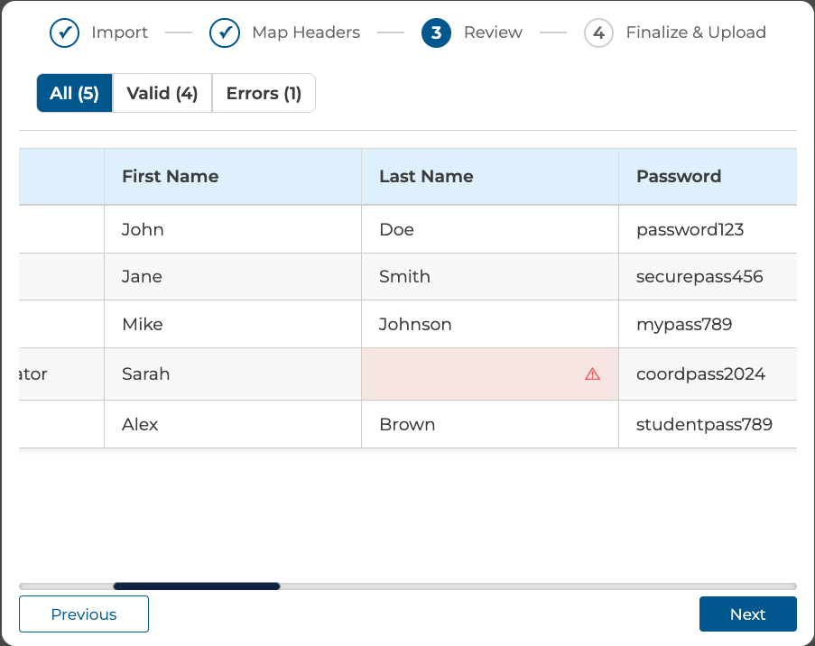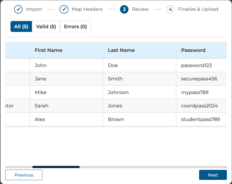 - Ensure all imported CSV headers are mapped to the correct Saga Roster Headers and click Next.
