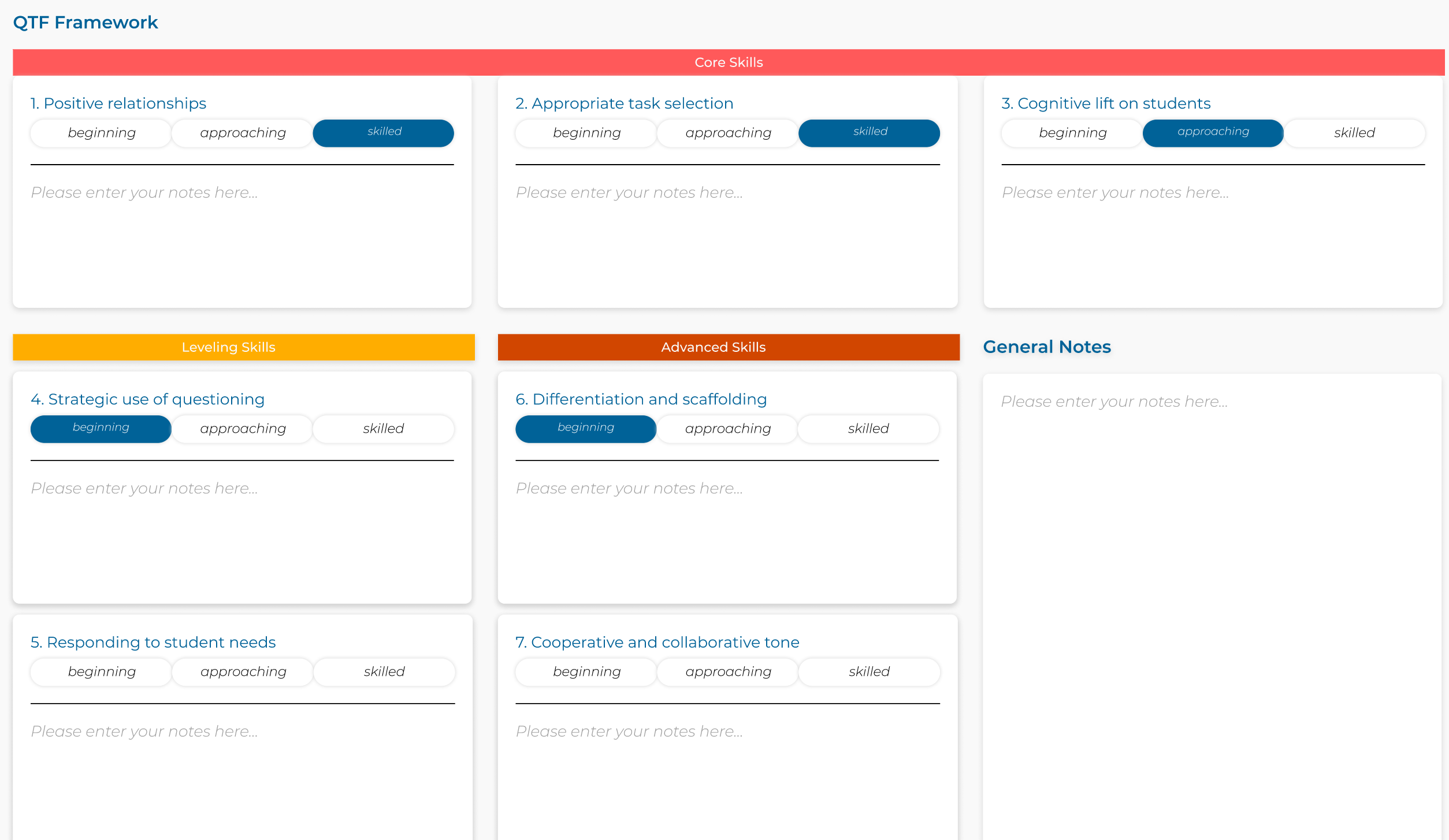 - You can also take notes for each of the Quality Tutoring Framework (QTF) skills