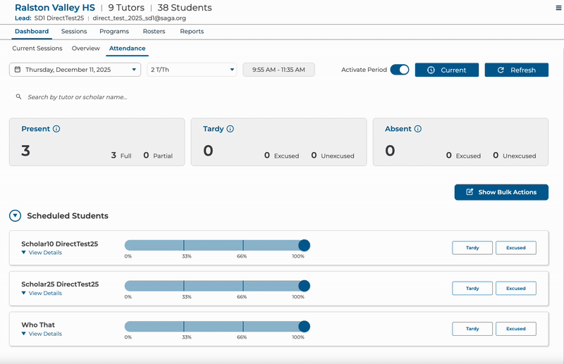The Bulk Actions button can be used to make change to multiple students at the same time by selecting all students or only selecting individual students.