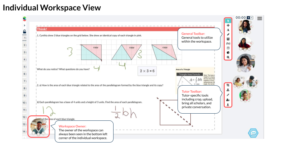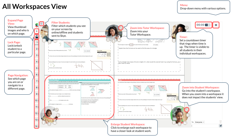 - Individual student workspaces let you zoom in for personalized support, provide feedback, or model a problem directly in their space.