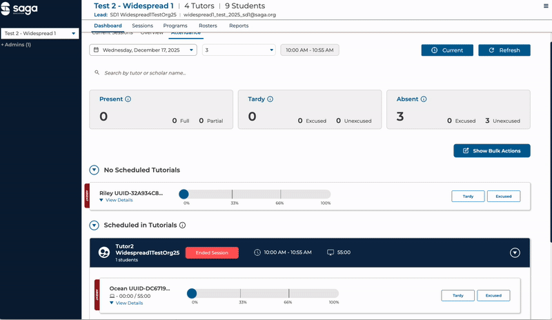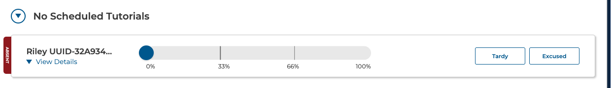 If your program tracks Math Exploration Time outside of scheduled tutorials, attendance can be taken manually for students in the No Scheduled Tutorials section: