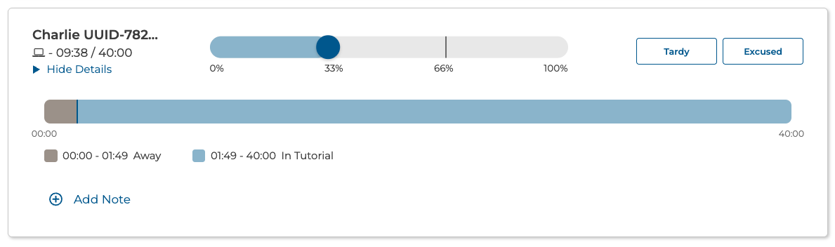 Clicking on View Details for students in Saga Connect tutorials, will expand to show a timeline and a place to add a note.