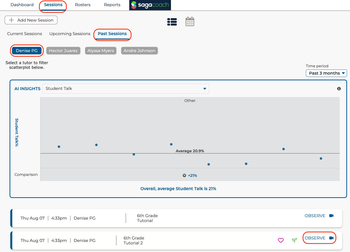 Use the Past Sessions sub-tab under Sessions to conduct Observations and use AI Feedback.