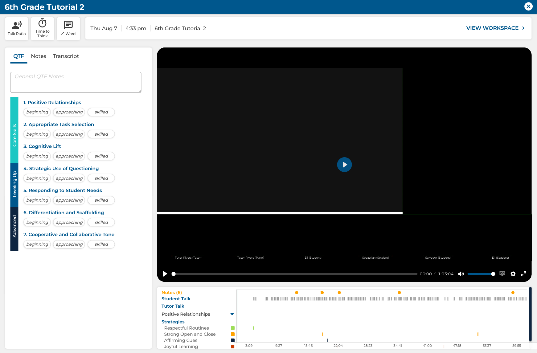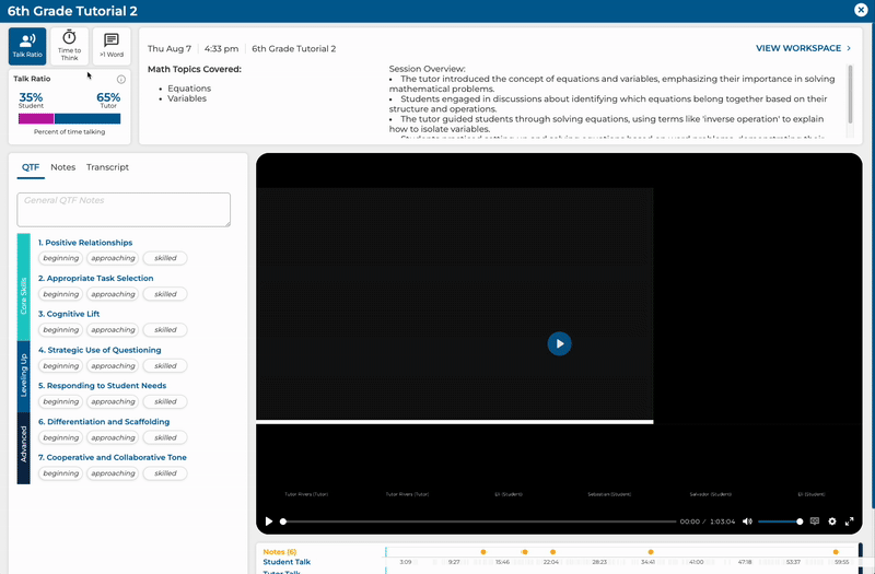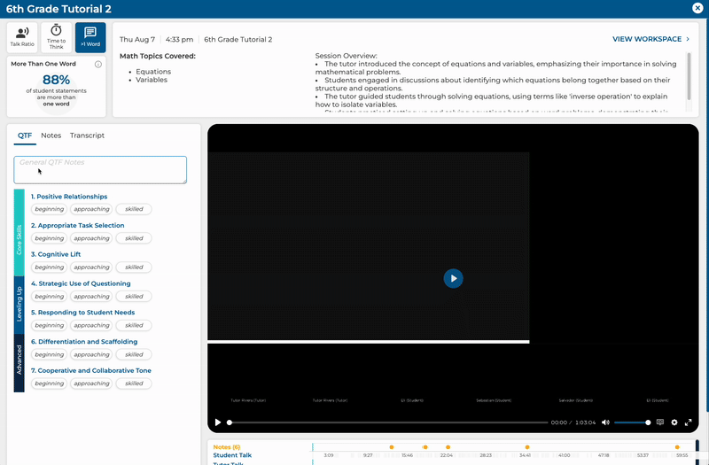 - This will open up the Past Session Viewer to review the session recording and provide ratings and notes for the skill areas shown on the left of the window.