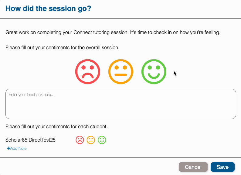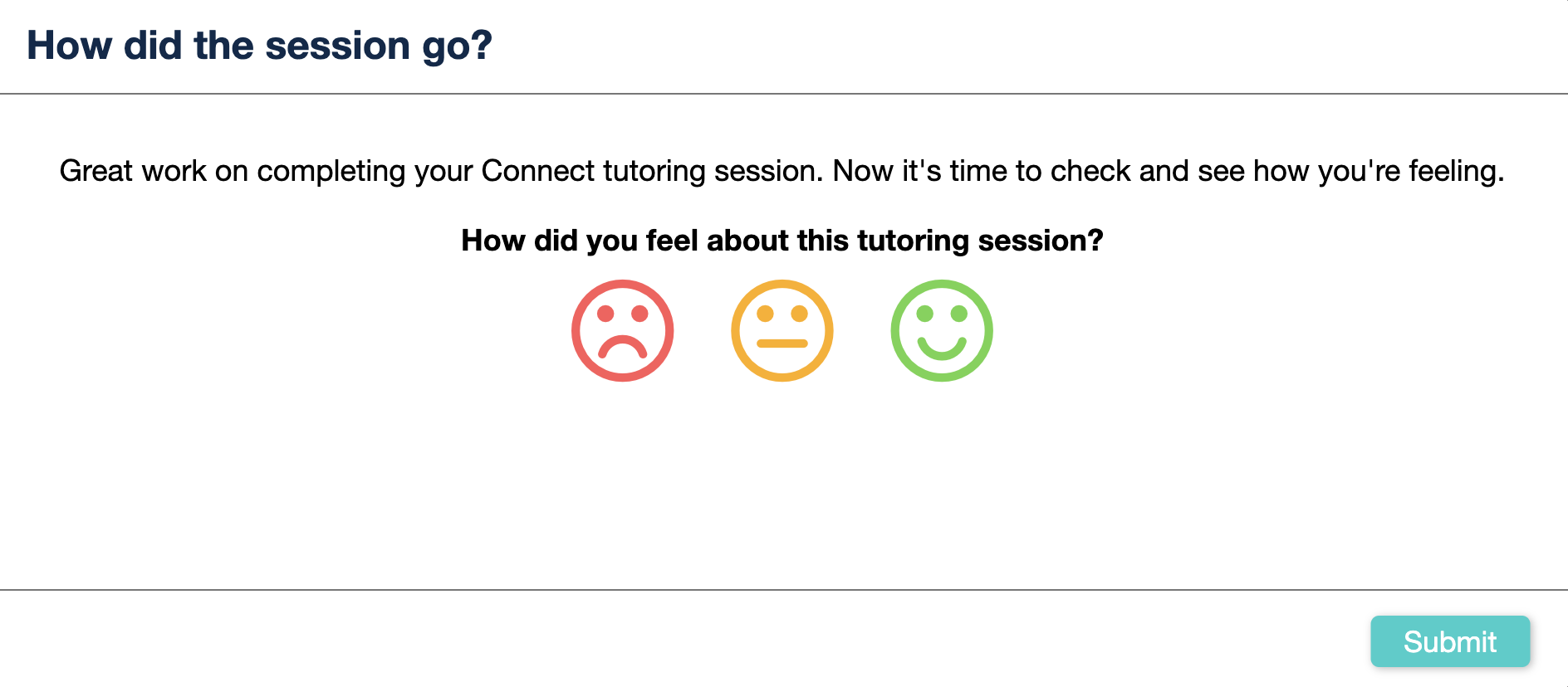 At the end of each session, a sentiment check occurs for both students and tutors to provide feedback about how the session went.
