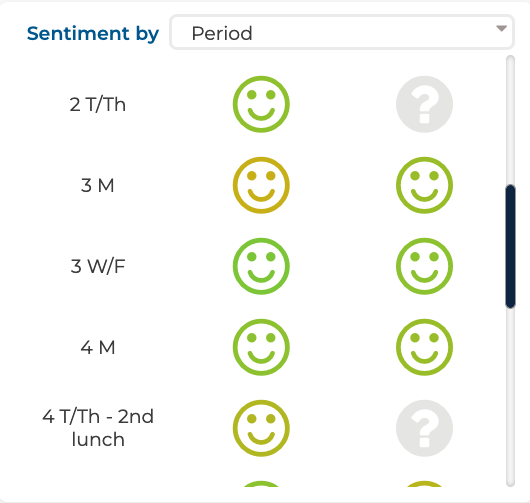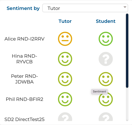 Sentiment checks are intended to give a general idea about how sessions are going from both the tutor and student perspective. Admins can filter by both Tutor and Period to get a better understanding of how things are going in tutorials.